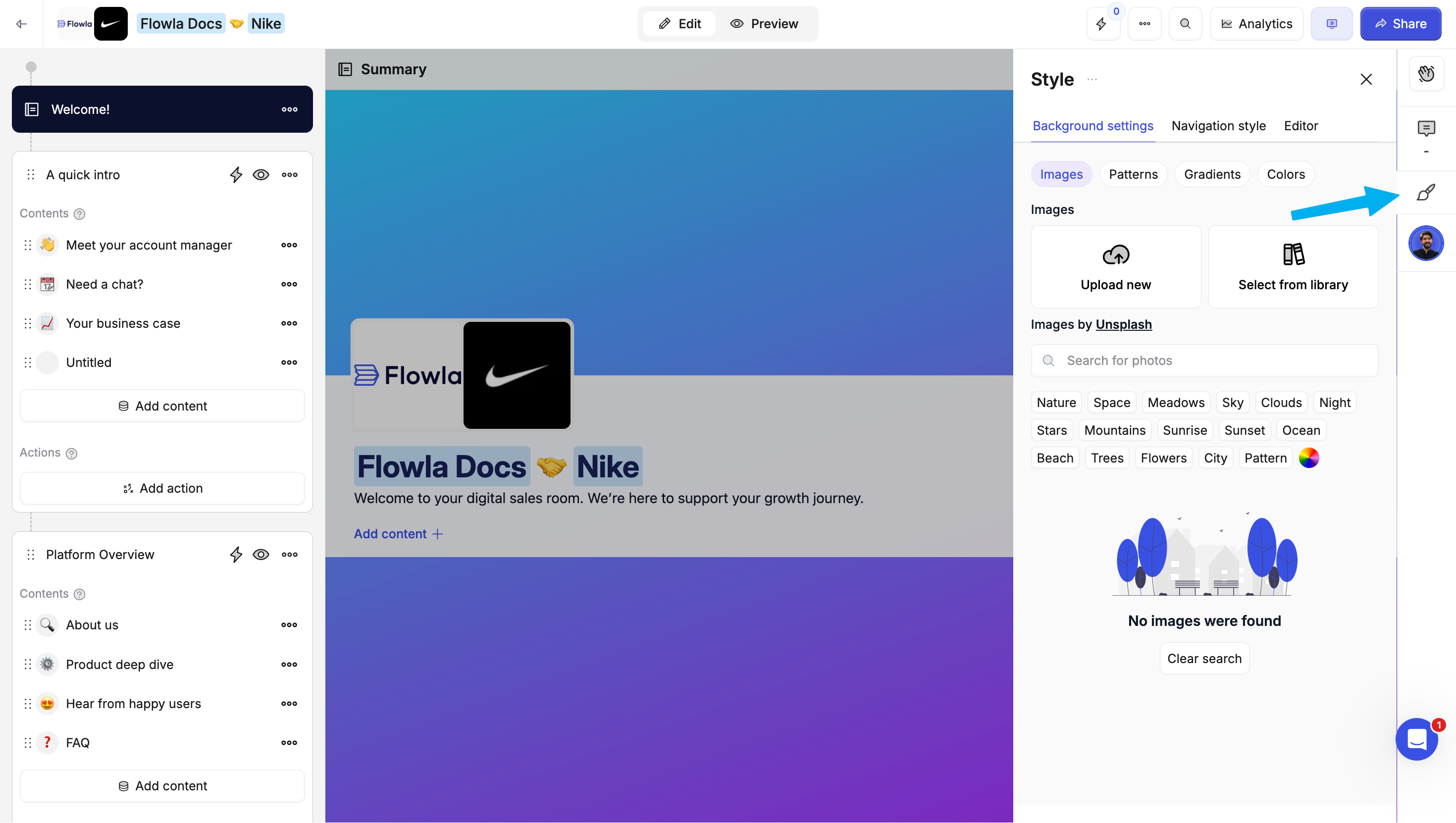 On the Style menu, in the Background settings tab, customize the room background:| Option | Description |